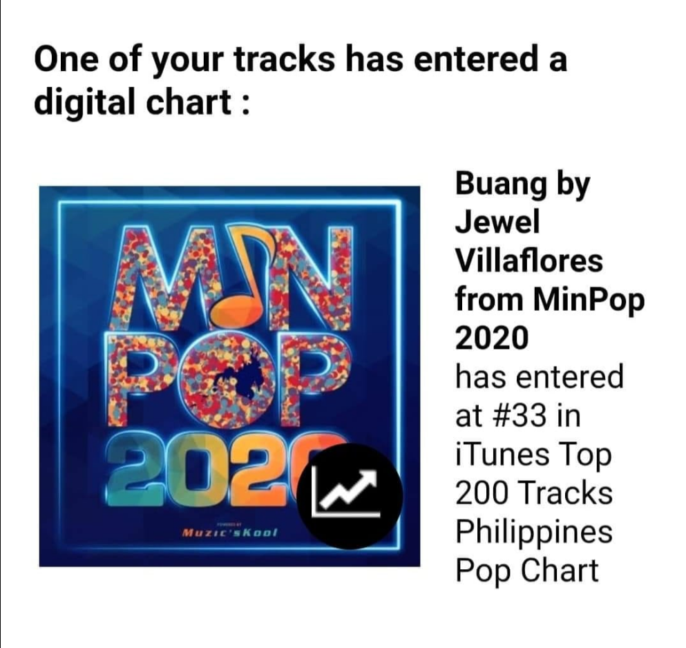 A year since its release but still hitting the charts! MinPop 2020 1st runner up song “Buang”, written by Sherwin Fugoso and interpreted by Jewel Villaflores is currently 33rd in iTunes’ Top Philippines Pop Chart!