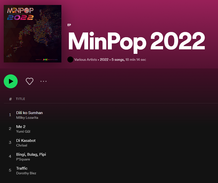 The MinPop 2022 Album is now available on all digital platforms worldwide! Check it out on Spotify, Deezer and Apple Music! https://open.spotify.com/album/4z7pvOF3Q0szv60ihzMz0n…#MinPop2022#PakpakMindanao