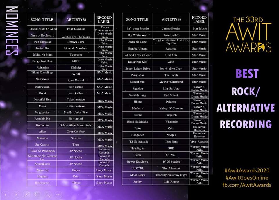 - “THEA – Best Rock/Alternative Recording for “Sa Kwarto”